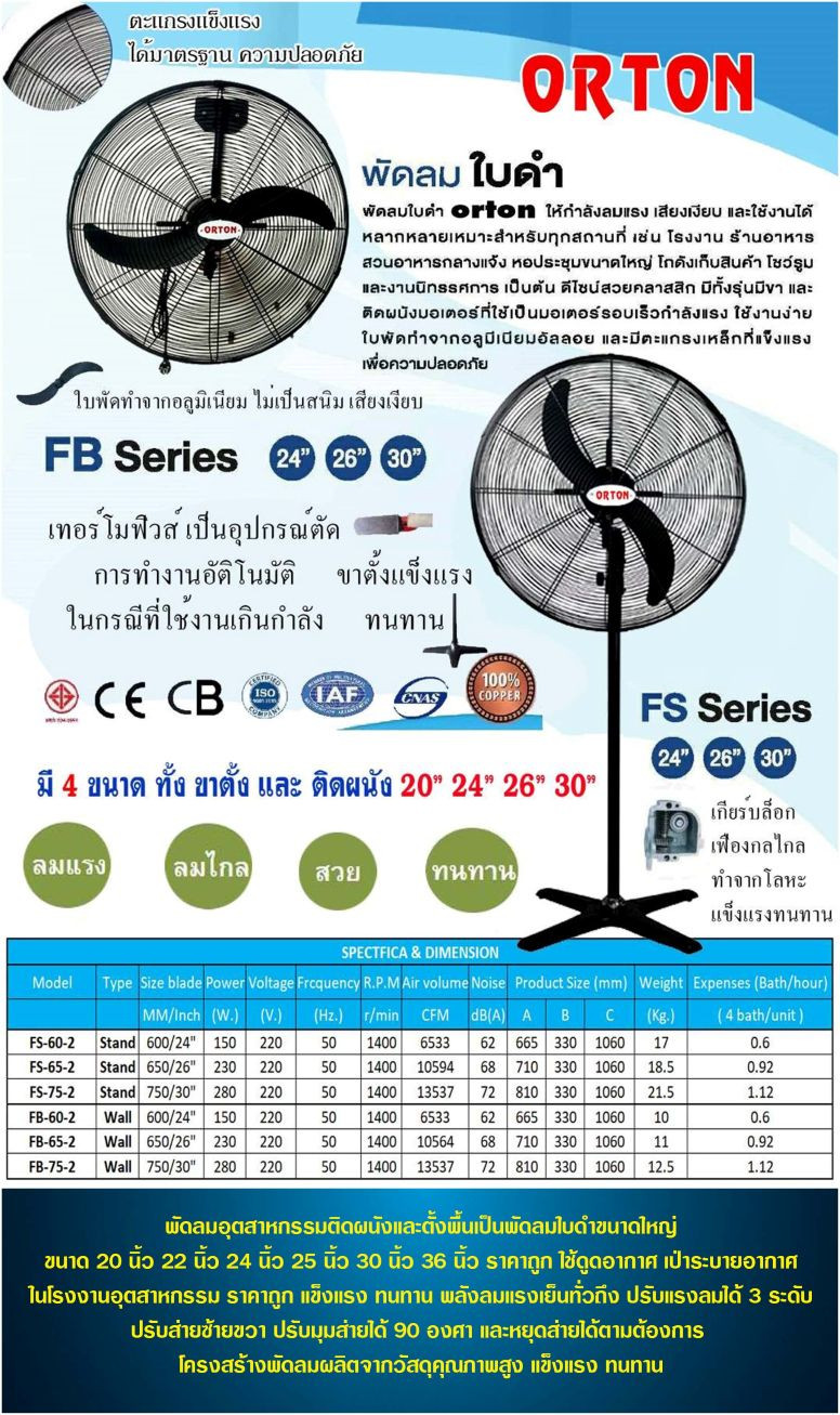 พัดลมอุตสาหกรรม คือ พัดลมระบายอากาศขนาดใหญ่ ช่วยลดความร้อนในโรงงาน มีโครงสร้างแข็งแรง ทนทาน ให้แรงลมสูง ใช้ในพื้นที่ขนาดใหญ่ เช่น โรงงาน โกดัง ฟาร์ม คลังสินค้า โรงยิม เพื่อช่วยระบายอากาศ ลดความร้อน กำจัดฝุ่นและกลิ่น พัดลมอุตสาหกรรมมีทั้งแบบติดผนังและแบบตั้งพื้น พัดลมอุตสาหกรรมใบดำ 2 ใบพัด แบบติดผนังและตั้งพื้น มีให้เลือก หลายขนาด 20 นิ้ว 24 นิ้ว 26 นิ้ว 30 นิ้ว 36 นิ้ว 50 นิ้ว ทนทานไม่เป็นสนิม ให้ปริมาณลมมาก ช่วยระบายอากาศในโรงงานได้ดี ทนทาน ประหยัดไฟ ปรับความแรงได้ 3 ระดับ ปรับส่ายได้ 90 องศา ให้ลมแรง โครงสร้างทำจากเหล็กคุณภาพดี แข็งแรงทนทาน ขาแขวนผนังปรับระยะได้หลายระดับ